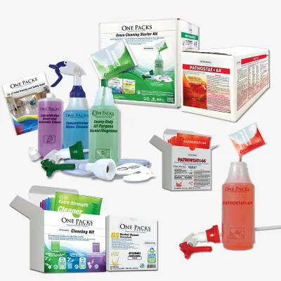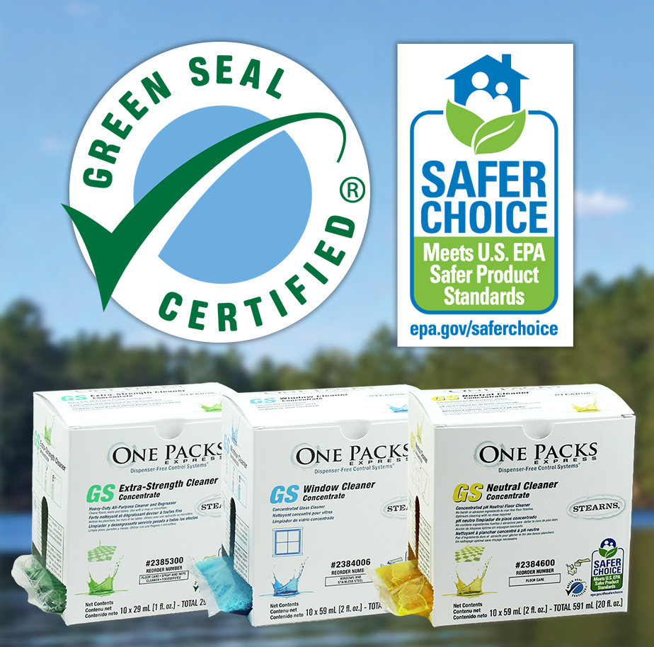 Experience the convenience of Stearns' concentrated One Packs cleaning solutions in pre-measured packets. Save storage space and reduce plastic waste, all while using eco-friendly packaged products that protect the planet!