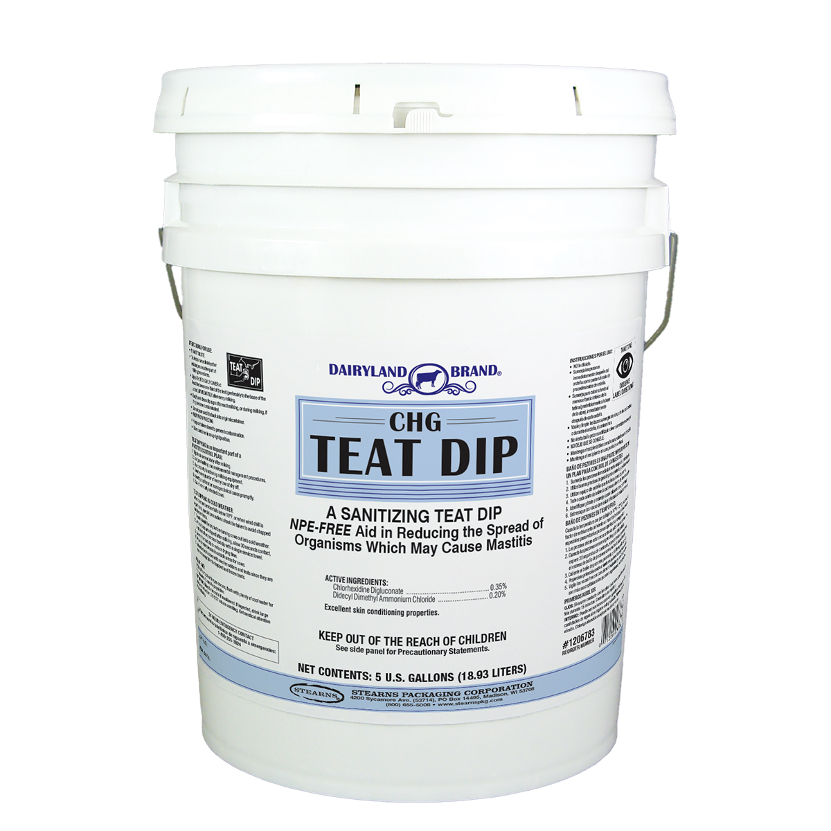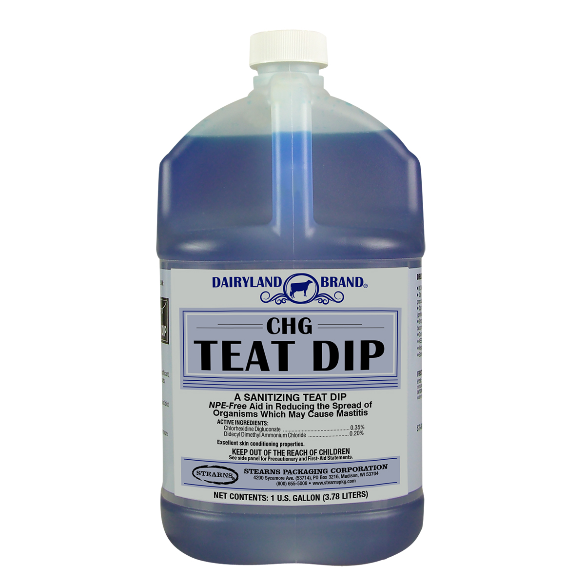 CHG Teat Dip has a unique dual action formula that contains 0.35% chlorhexidine gluconate and 0.20% quaternary ammonium. Mild to the teat and skin. Its deep blue color shows you which teats have been dipped. A sanitizing teat dip — an aid in reducing the spread of organisms which may cause mastitis.