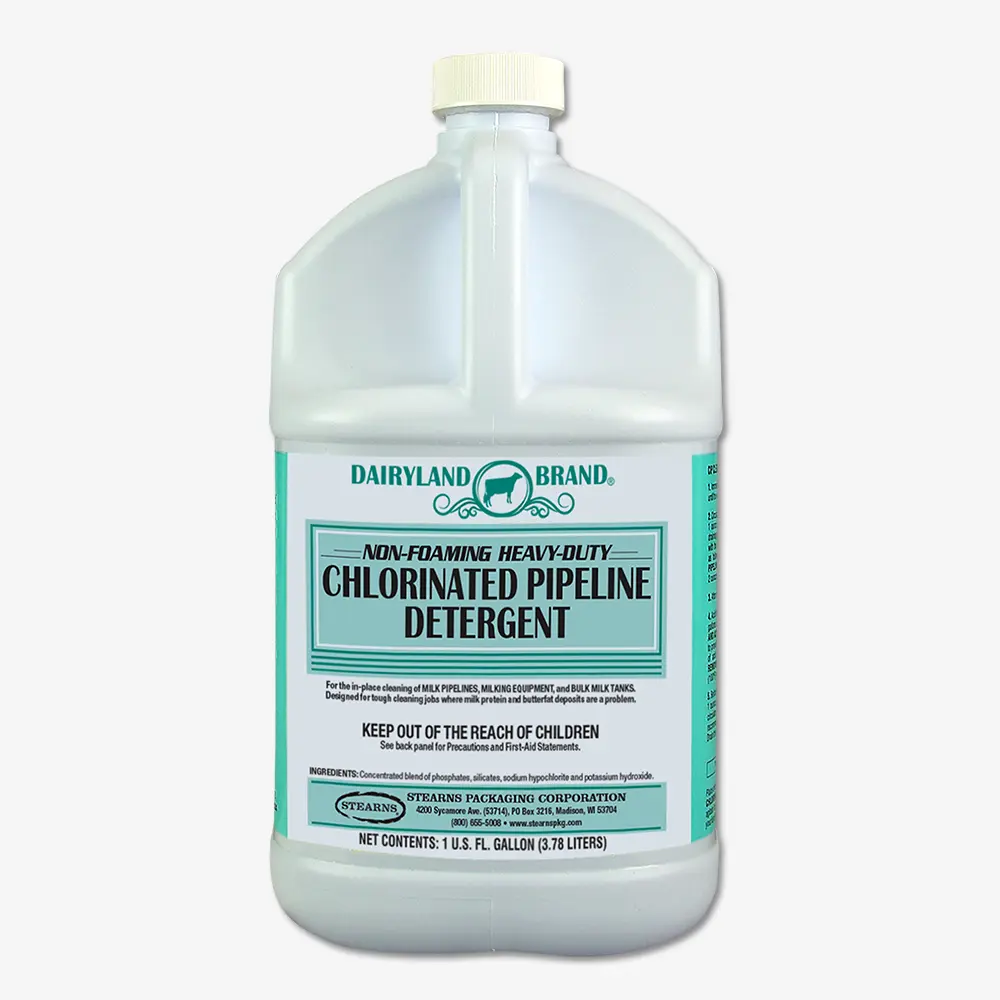 Liquid Chlorinated Pipeline Detergent is a potent, non-foaming, highly alkaline cleaner for automatic circulating applications. Fortified with chlorine to cut milk residues quickly, it leaves tanks and pipelines clear and shining clean. Buffered with silicates and complex phosphates. Excellent in hard water.
